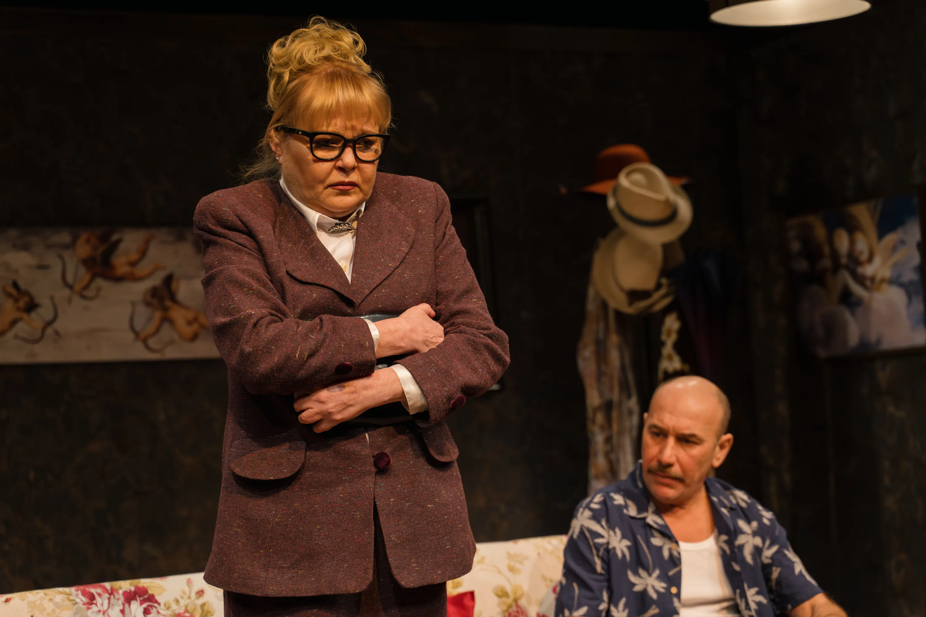 Картини з ангелами-херувимами доповнюють візуальну лінію вистави. Вони виступають іронічним контрапунктом до пікантних і часто кумедно-незграбних ситуацій, що розгортаються на сцені, підсилюючи комічний ефект, але не нівелюючи людську драму за сміхом.